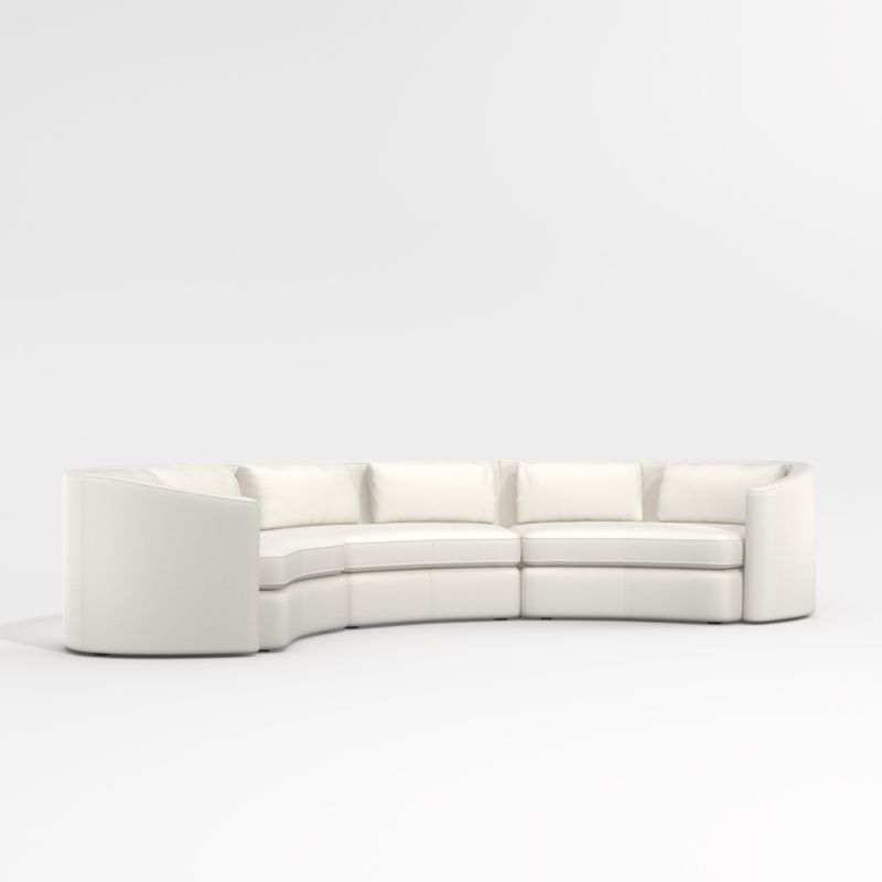 Our Nouveau sectional is a curvy, style-forward stunner that invites you to unwind with open arms. The combination of a wedge and right- and left-arm sofas sweeps a fluid curve from arm to back, hosting squishable back pillows that are scaled slightly smaller to enhance the effect. With soft yet firm cushions that sit somewhere between upright and loungey, the three-piece sectional makes itself at home in casual and more formal settings. Upholstered in a performance polyester fabric made from recycled plastic water bottles, the Nouveau sectional sofa is a Crate & Barrel exclusive.