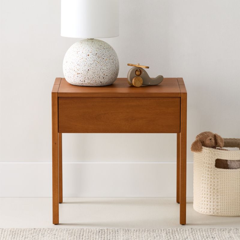 Solid FSC®-certified wood shapes our streamlined, Japanese-inspired Nova Nightstand—finished in a teak hue that highlights the handsome wood grain. Set on slightly tapered legs, the nightstand features a single flat-front drawer for storing all their nighttime essentials. A butterfly joint inlay in natural ash accents the sides of the piece for a unique, sophisticated touch. Pair with our Nova Dresser for a coordinated look that's equally at home in a nursery or a big-kid room.
