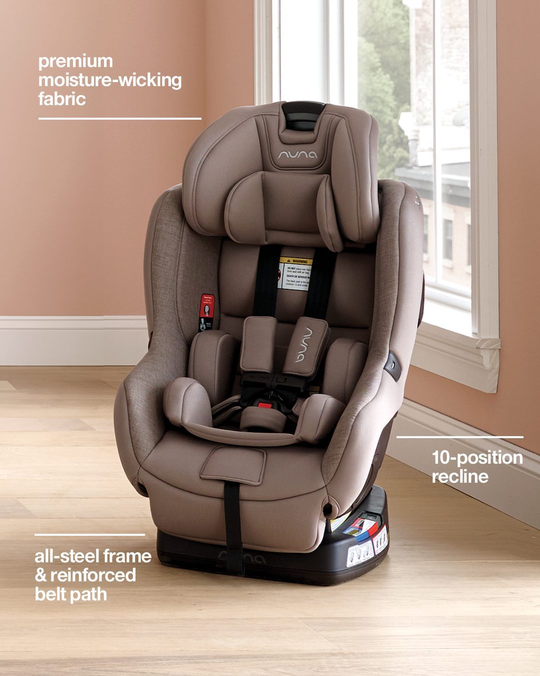 Hit the road ready with the uncomplicated and unfussy Nuna RAVA Caviar Black Convertible Car Seat. Designed for easy installation, the RAVA offers colored belt path indicators and simple instructions that make setup a snap so you can install with confidence. Plus, signature muscle-free True Tension doors provide a secure fit without the struggle. Little extras like laid-back leg room, premium moisture-wicking fabric, and a covered harness adjuster keep little ones comfortable no matter the distance. And parents can rest easy thanks to features like energy-absorbing foam, an all-steel frame, and no added fire retardant chemicals.