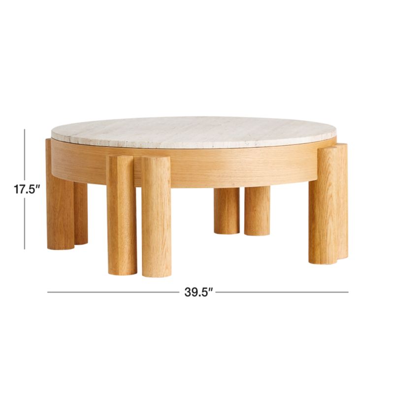 Oasis puts the raw beauty of nature in focus with elegant symmetry, minimal finishes and sculpted forms. Shaped into circles supported by a quartet of paired column legs, the oak coffee table is given a heavy wire-brushed finish to bring out the wood grain and create a textural sensation of unfinished timber. The travertine marble top continues the natural tones with a matte, honed surface finish. Naturally occurring pits and pock marks are filled in with a clear matte resin to highlight the stone's porous qualities. The Oasis coffee table is a Crate and Barrel exclusive.