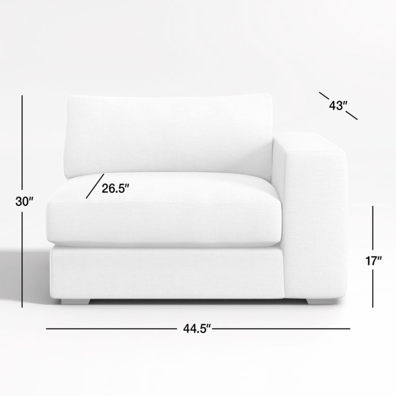 The modern ease of coastal living, no matter where you live. Our Oceanside sectional brings laid-back style to the living room with its clean lines, soft-yet-supportive cushions and ultra-wide arms for perching your drink or device. Scaled with an extra-deep and low seat, the right-arm chair is great for anyone who loves laid-back lounging and a low, modern look. And as your go-to place for lounging, you'll love Oceanside in our durable, family-friendly performance fabric. Combine the right-arm chair with other components to form an Oceanside sectional that's perfect for your space.
