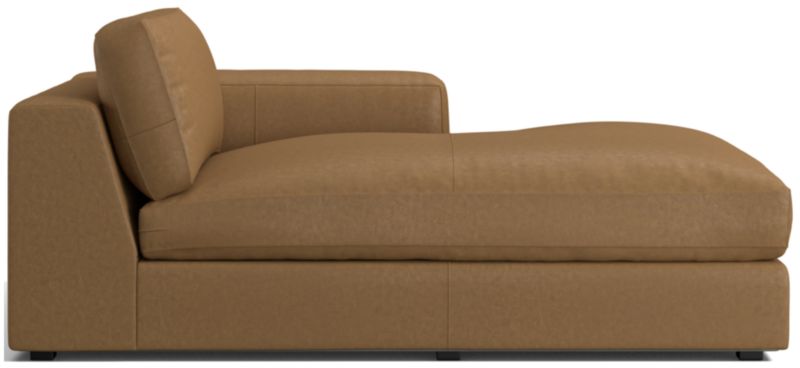 The rich color and buttery softness of top-grain leather brings sleek sophistication to the breezy ease and modern attitude of our Oceanside sectional collection. Set on one-inch legs recessed just beyond the shadow line, the low-profile chaise floats in a room. The wrap-around flow from arm to back gives it a neat, fully finished look from any angle. Soft-yet-structured cushions provide just enough support for a comfortable seat you won't want to leave. Combine the right-arm chaise with other Oceanside sectional pieces to create just the right configuration to suit your space.