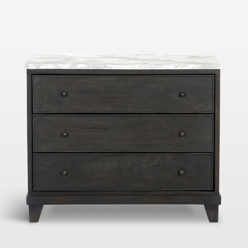 Odette captures the allure of vintage French furniture, edited for contemporary homes with clean lines, artisanal details and a fresh mix of materials. Mango wood and mixed hardwoods enhance the nightstand's heirloom appeal with natural markings that make each piece unique. A white Statuario marble top contrasts with the gunmetal grey finish, featuring the distinctive veining and color nuances of this prized variety of Italian marble. Grey-finished button pulls on the three drawers add grace notes of charm to this elegant bedside table.
