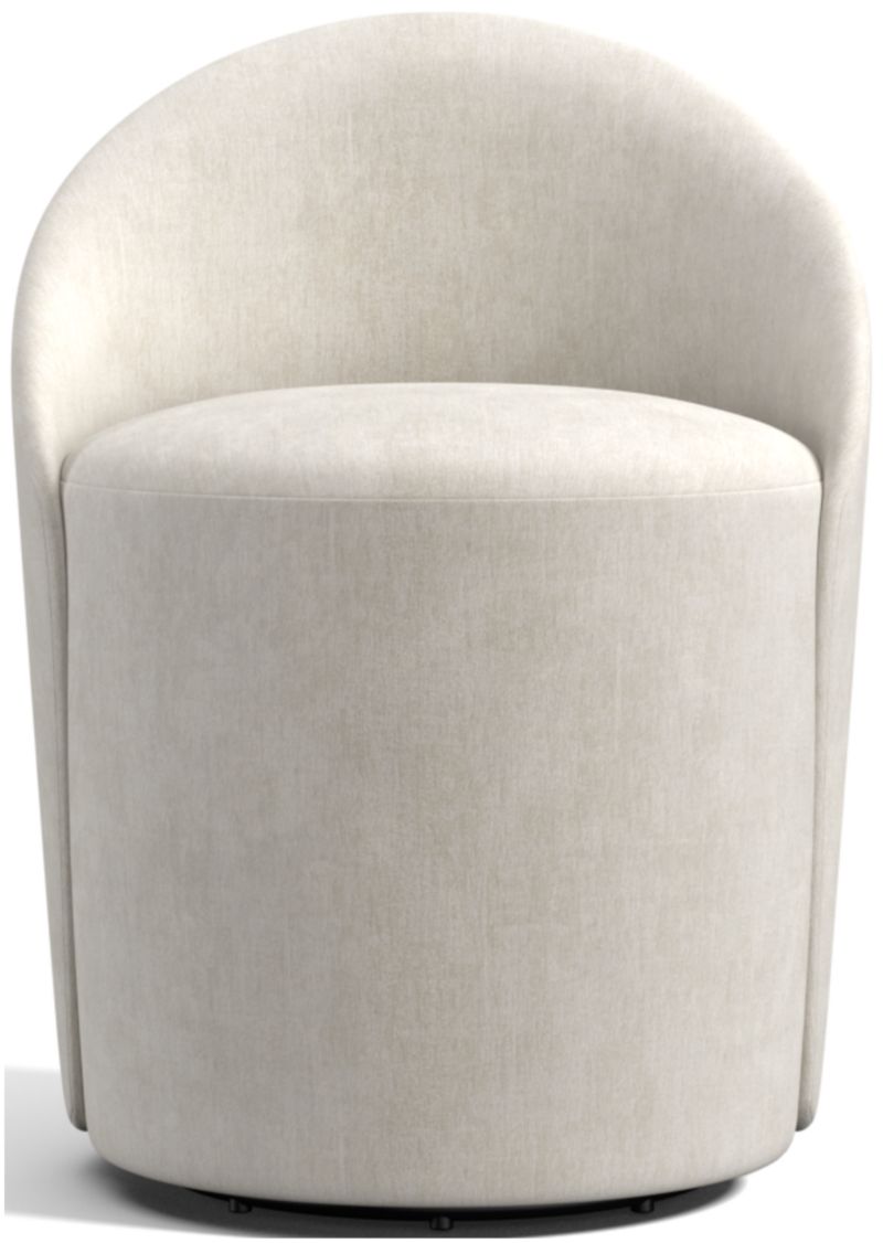 All fresh curves and comfort, Odette offers a statement-making seat designed for lingering. A cushioned cylinder shapes an all-in-one seat and base, enfolded by a rounded back panel padded for relaxing. Fully upholstered in fabric, the chair swivels to let you easily follow tableside conversation and to give you a sweeping view of the dining room.