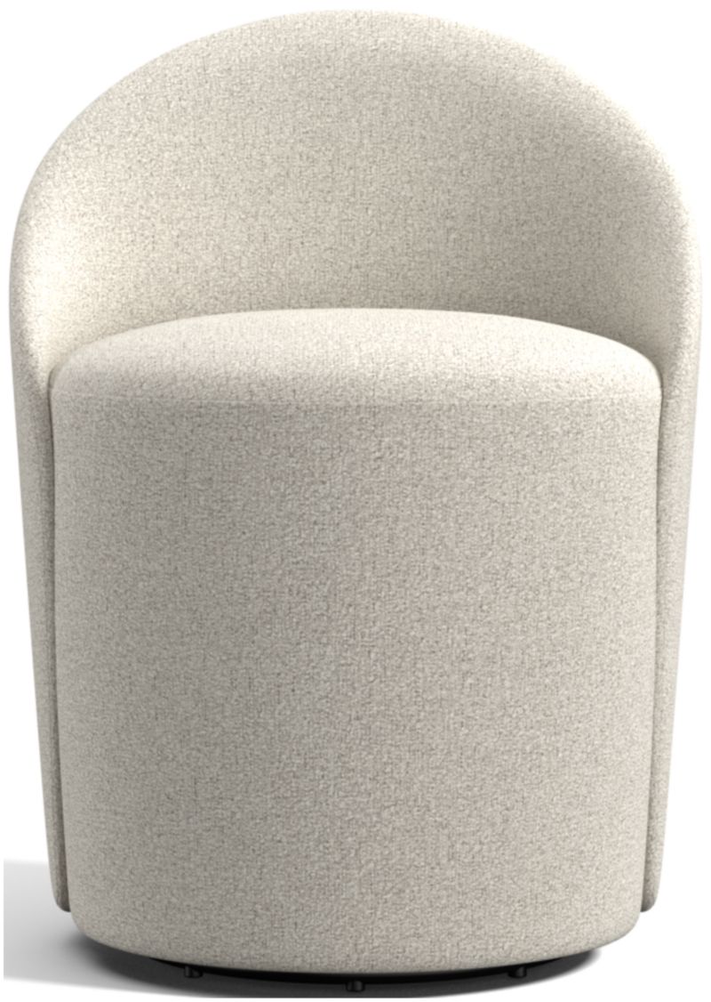 All fresh curves and comfort, Odette offers a statement-making seat designed for lingering. A cushioned cylinder shapes an all-in-one seat and base, enfolded by a rounded back panel padded for relaxing. Fully upholstered in fabric, the chair swivels to let you easily follow tableside conversation and to give you a sweeping view of the dining room.