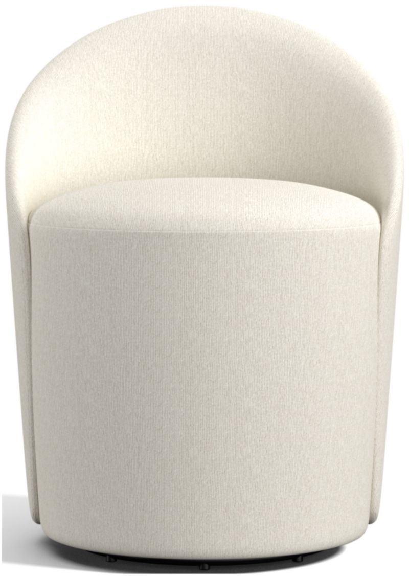 All fresh curves and comfort, Odette offers a statement-making seat designed for lingering. A cushioned cylinder shapes an all-in-one seat and base, enfolded by a rounded back panel padded for relaxing. Fully upholstered in fabric, the chair swivels to let you easily follow tableside conversation and to give you a sweeping view of the dining room.