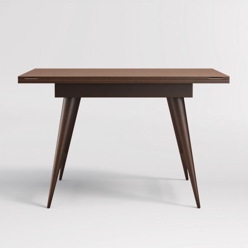 A multitasker for small spaces, our Olivier desk flips its top to convert to a dining room table for four. As a desk, Olivier provides a generous work surface with a small storage space below for pens, paper pads and notebooks. Discreet indentations on the corners help open the desktop to the table configuration. Tapered conical legs set at a stylish angle complement the clean lines and nod to Olivier's mid-century inspiration. Made by skilled furniture makers, the tulipwood and tanganyika walnut veneer desk showcases a hand-applied, multi-step finish we call Aretina. A Crate and Barrel exclusive, the Olivier desk brings clean lines and versatility to apartments and small living spaces.