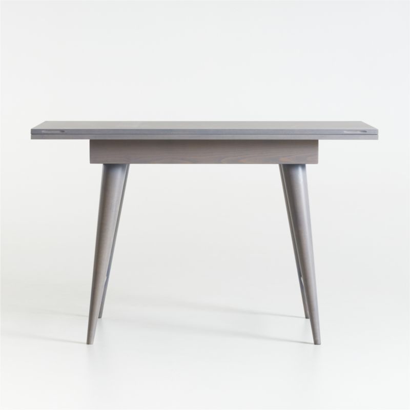 A multitasker for small spaces, our Olivier desk flips its top to convert to a dining room table for four. As a desk, Olivier provides a generous work surface with a small storage space below for pens, paper pads and notebooks. Discreet indentations on the corners help open the desktop to the table configuration. Tapered conical legs set at a stylish angle complement the clean lines and nod to Olivier's mid-century inspiration. Made by skilled furniture makers, the tulipwood and tanganyika walnut veneer desk showcases a hand-painted dove grey finish. A Crate and Barrel exclusive, the Olivier desk brings clean lines and versatility to apartments and small living spaces.