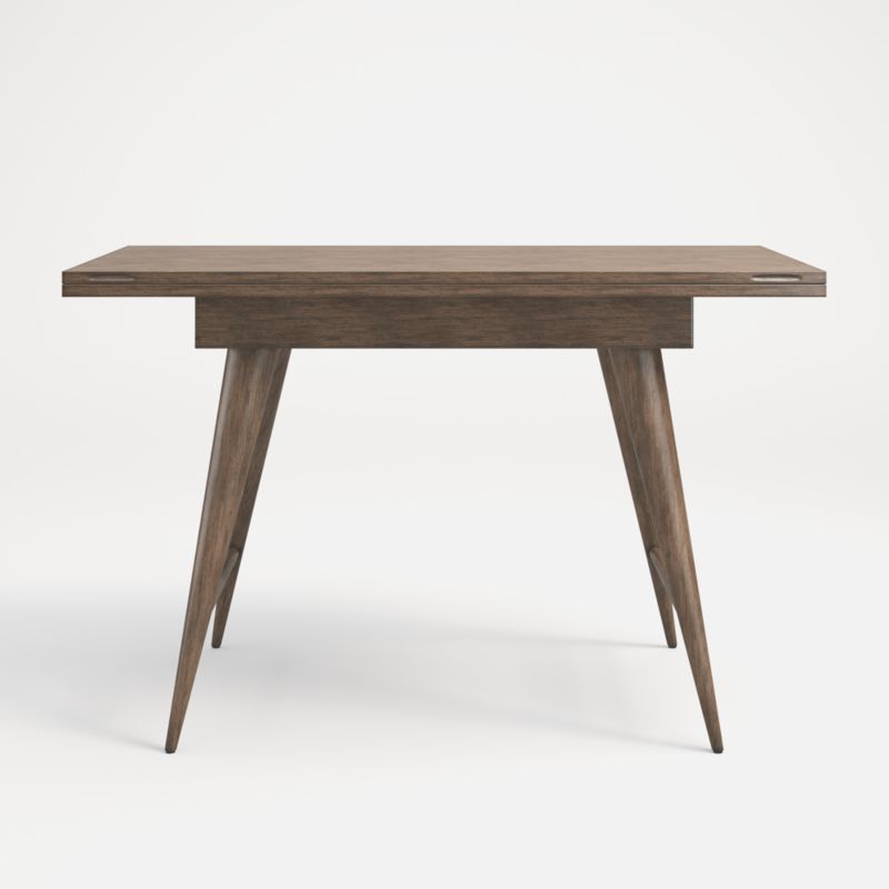 A multitasker for small spaces, our Olivier desk flips its top to convert to a dining room table for four. As a desk, Olivier provides a generous work surface with a small storage space below for pens, paper pads and notebooks. Discreet indentations on the corners help open the desktop to the table configuration. Tapered conical legs set at a stylish angle complement the clean lines and nod to Olivier's mid-century inspiration. Each tulipwood and tanganyika walnut veneer desk undergoes a multi-step process hand-applied by Italian artisans to create the grey-brown stain finish we call Pinot Lancaster. A Crate and Barrel exclusive, the Olivier desk brings clean lines and versatility to apartments and small living spaces.