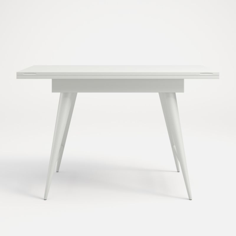 A multitasker for small spaces, our Olivier desk flips its top to convert to a dining room table for four. As a desk, Olivier provides a generous work surface with a small storage space below for pens, paper pads and notebooks. Discreet indentations on the corners help open the desktop to the table configuration. Tapered conical legs set at a stylish angle complement the clean lines and nod to Olivier's mid-century inspiration. Made by skilled furniture makers, the tulipwood and tanganyika walnut veneer desk showcases a hand-applied, multi-step white painted finish with distressing. A Crate & Barrel exclusive, the Olivier desk brings clean lines and versatility to apartments and small living spaces.