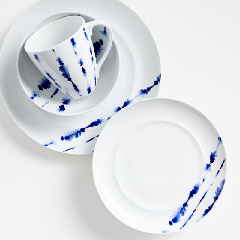Inky blue ripples across bright white porcelain, evoking hand-dyed shibori fabric. The simple shapes of the crisp white place setting provide the perfect canvas for the bands of blue that disperse in watercolor-like undulations. This four-piece place setting includes a salad plate, dinner plate, bowl and mug. To complete the look, add patterned blue table linens and our Omri serving pieces.