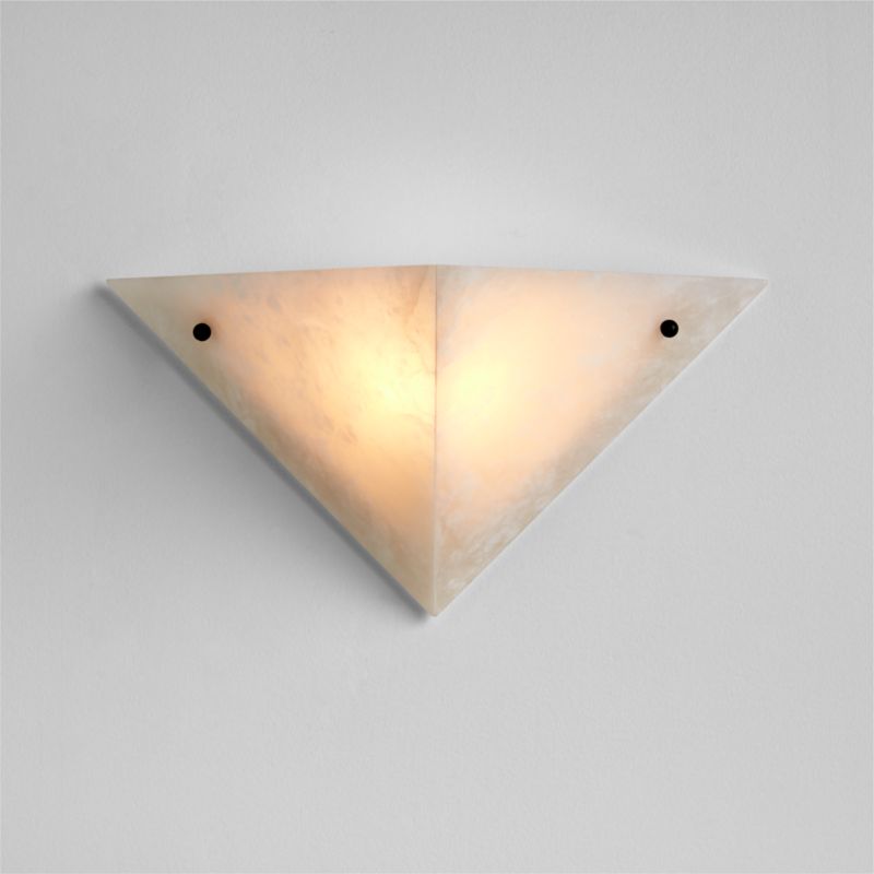 After working with stone in her designs for many years, Athena Calderone wanted to play with the translucency of alabaster. Her Onirique sconce makes use of thin sheets of alabaster, which allow light to shine through while conserving the precious material. The shade showcases the stone's natural beauty and unique markings on its two planes—features that are enhanced to a gorgeous glowing effect when illuminated. A warm white diffuser affixed with two black finials further softens the cast light. Epitomizing the designer's signature style, the exquisite wall sconce and coordinating table lamp and pendant celebrate simplicity and geometry.