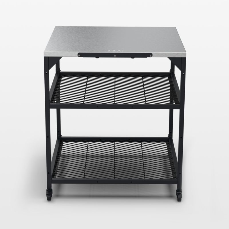 Create the ultimate outdoor pizza station with this modular table, designed to support your Ooni pizza oven (sold separately). Crafted of black carbon steel, the large table is topped with a sleek stainless steel work surface. Adjust the two shelves to hold the propane tank, wood pellets, waterproof cover and other essentials, and hang cooking tools from the built-in hooks so they're right at hand. Wheels roll the cart from garage to patio or wherever the pizza party happens to be, then lock securely when it's time to cook. The modular table upgrades the already-impressive Ooni pizza-making experience.