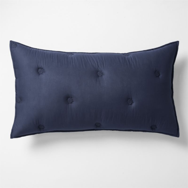 An organic array of understated dots patterns this pillow sham for a sophisticated yet playful look. The embroidered circles tuft the cover for a handmade feel. Organic cotton in lush blue weaves the supersoft, lightweight voile, while the voluminous fill creates plush coziness. The pillow sham layers with our other deep indigo bedding to make a modern organic bed.