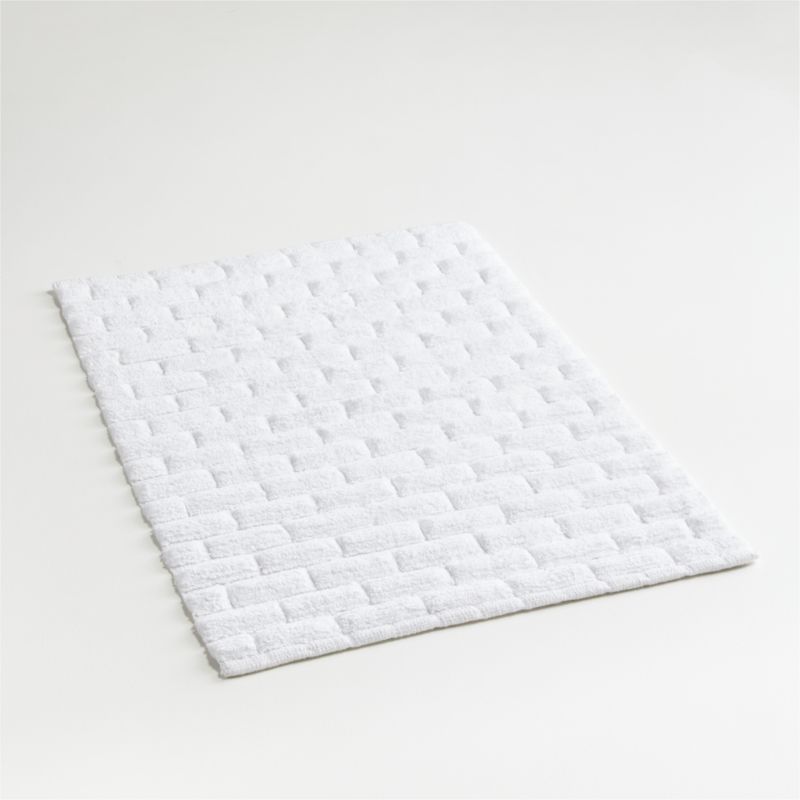 Woven with a grid of rectangles, this white bath mat emulates the stylish geometry of subway tile. Made of pure organic cotton, the plush, luxurious mat soaks up moisture while feeling great underfoot. Our Subway bath mat is a Crate & Barrel exclusive.