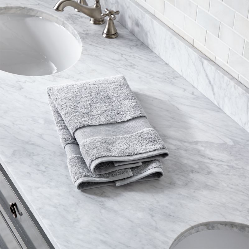 Luxurious Turkish organic cotton yarn weaves extremely soft, plush and dense towels. Made of double-ply cotton threads to ensure strength and durability, our grey Turkish hand towel is woven with a looped rather than tight construction to dry quickly. An intricate herringbone dobby weave border on either end adds a bit of elegant detail. Washing will only make this exceptional textile more absorbent and soft. Coordinates with our other Turkish towels.