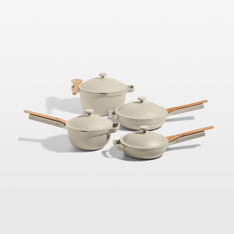 Multi-functional and striking in fun, matte colors, Our Place's cookware tackles all your cooking tasks. The recycled aluminum pots and pans in the set are lightweight, durable and three times more heat conductive than stainless steel. Scaled deep for greater versatility, the cookware is coated in a proprietary ceramic non-stick coating for effortless cooking. Lids feature a domed design to promote self-basting and self-drain for convenient serving. Beechwood spoons and spatulas are included, notched ones attaching to the pegged handles to eliminate the need for space-consuming spoon rests.