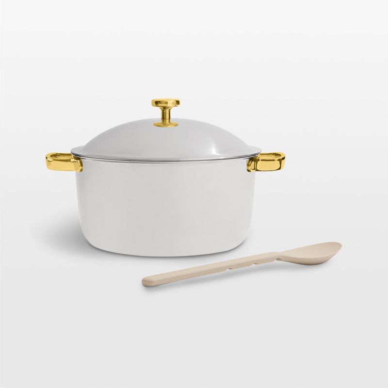 Experience chef-worthy results, high performance and exceptional durability with Titanium Pro cookware from Our Place. Try-ply construction provides the benefits of a high-shine stainless steel exterior, quick-heating aluminum core and a virtually indestructible titanium interior. NoCo technology constructs rather than coats surfaces to create a non-stick environment—no harmful chemicals involved. The interior is pressed with a pattern that creates sunken pockets to facilitate airflow and reduce food adhesion, and the dome-shaped lid locks in steam. Gold-finished handles and knob add major glam—and the included silicone spoon is notched to rest securely on one of the stay-cool handles.