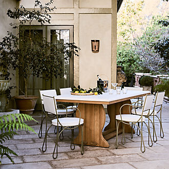 Prefer your patio furniture to have a natural look? Consider a set of unfinished patio furniture made of weather-resistant teak wood. Then, allow it to weather naturally to a mild grey, or add a teak protector to maintain the wood's warm tone. A set featuring a sofa, chairs and a dining table coordinates on the deck or beneath a pergola. Look for Sunbrella cushions in the same bright hue or pattern for a uniform feel. Or, shop individual pieces for your balcony, front steps or lanai. If you're a frequent warm-weather host, consider outdoor kitchen furniture like a combination bar and workstation or a table drop leaf table for extra surface area. Ottomans also provide for versatile use—acting alternatively as foot rests or additional seating. Complete your outdoor entertaining space with melamine dinnerware, outdoor lighting and planters to showcase fresh blooms.