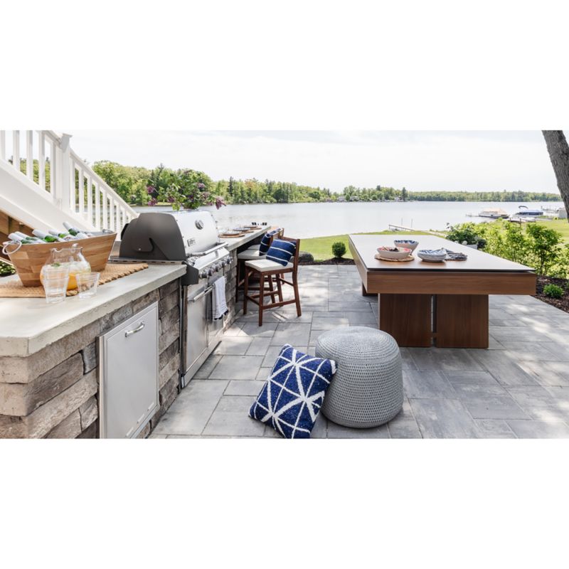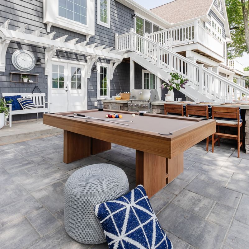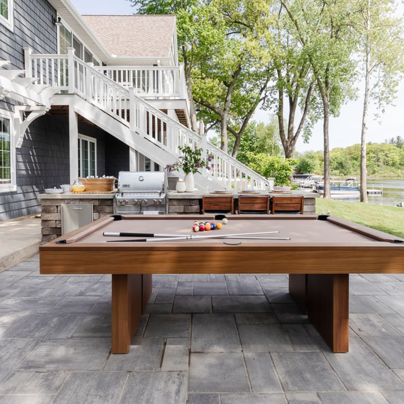 This stunning pool table combines two tables in one for outdoor competition and leisurely al fresco dining. Made for us exclusively by Imperial USA, this weather-resistant table spares no detail in bringing you the ultimate game of pool in a clean, modern design you'll treasure for years. Everything's included to get games going, including cues, balls, ball rack and chalk. Once everybody's worked up an appetite, the coordinating wood-look top transforms the game table into an elegant dining table. Crafted of durable aluminum with a gorgeous faux bois finish and weather-resistant khaki felt, this outdoor pool table is not only handsome, it is specially constructed to last and perform. The fitted cover protects the table from the elements when not in use.