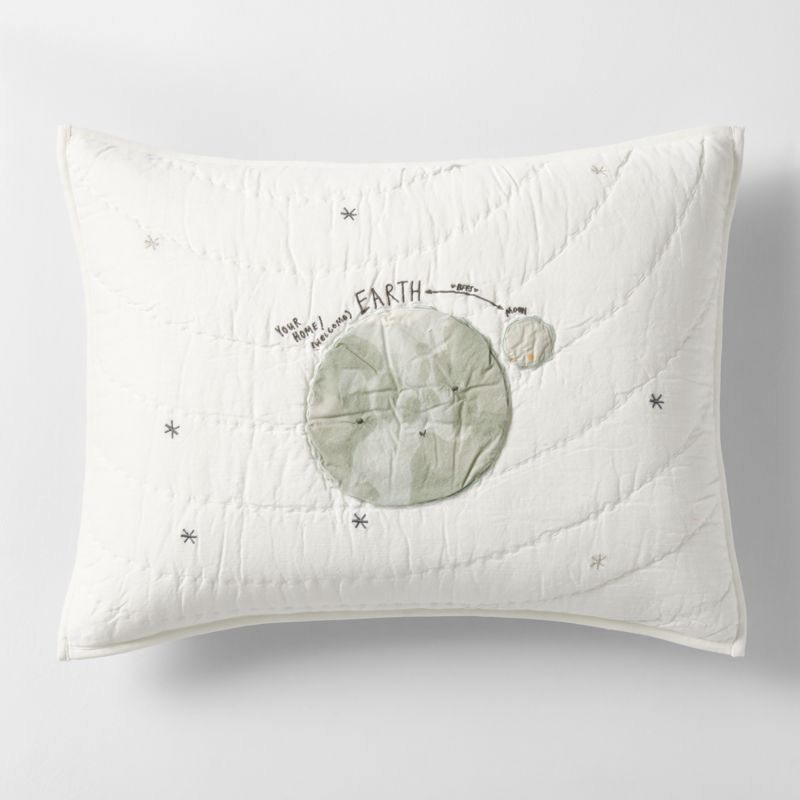 Want to get kids excited about bedtime? Layer their bed with playful bedding that embraces what they love. Our Outer Space Pillow Sham brings planet earth to life with a fun applique and embroidered details, from a sweet little face to a "handwritten" fun fact. And the oh-so soft organic cotton keeps little ones comfy and cozy. Pair with our coordinating Outer Space Organic Cotton Quilt and Sheet Set for a look that's out of this world.