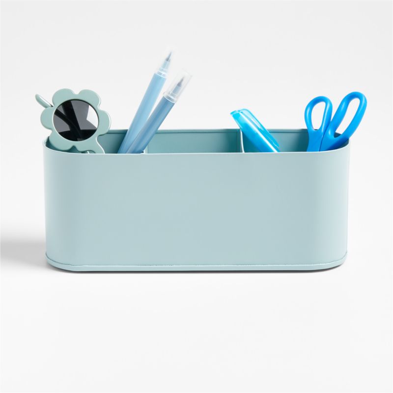 Designed to conquer clutter in the study zone, our Outline metal Study Desk organizer helps kids keep pens, crayons, scissors and more sorted and stored with precision and style. Durable galvanized metal construction and a pastel blue powdercoat finish help it weather the years beautifully with a minimalist silhouette that fits in anywhere. The three compartments are deep enough to corral a bunch of pencils and keep rulers and brushes upright and always within easy reach. Partner this caddy with the coordinating Outline metal storage bin and wall shelf for a designer approach to modern organization. What's more: this kids' organizational solution makes for a thoughtful gift.
