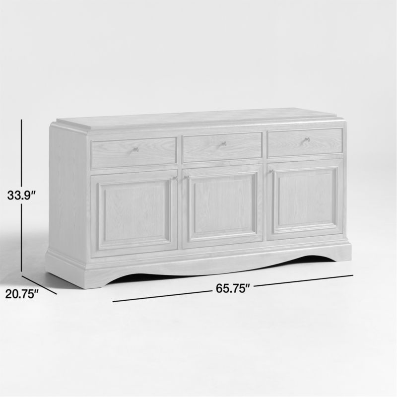 Inspired by the elegant yet rustic look of traditional Swedish furniture, our Owlwood credenza brings understated style to modern and transitional decor. Made of solid oak and oak veneer finished in warm barley, the cabinet's elevated detailing includes classic molding and stunning checkerboard marquetry on the top. Storage space is organized in threes—a trio of drawers and three cabinet doors that each open to an adjustable shelf. Burnished brass decorative key pulls add to its heirloom charm.