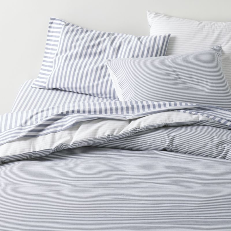 Inspired by menswear, our Oxford Shirting collection brings a touch of tailoring to the bedroom. This duvet cover patterned with double pinstripes in deep indigo blue and crisp white reverses to ticking stripes in the same classic palette—just flip to keep the look fresh. Mix and match the washed organic cotton duvet with the Oxford Shirting pillow shams and sheet set or our other striped bedding to make a well-dressed bed.
