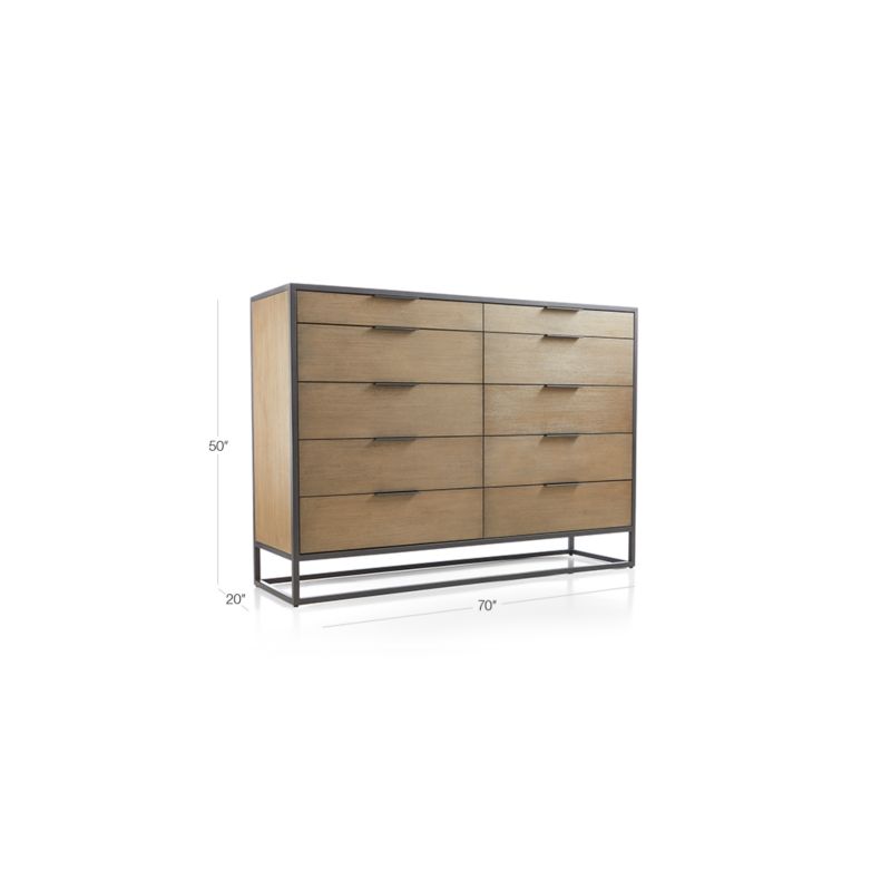 Hand-finished in brushed charcoal, the iron frame outlines 10 soft-closing drawers, each made of wire-brushed acacia wood that's been stained shale grey. Slim, horizontal pulls accentuate the dresser's sense of movement. The Oxford Black Shale 10-Drawer Tall Dresser is a Crate and Barrel exclusive.