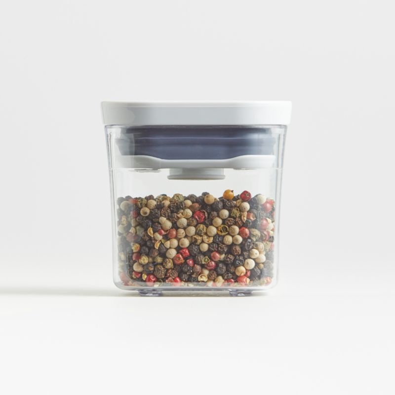 Store everything from dried herbs or spices to hair ties or cotton pads in this airtight container. The clear plastic vessel makes it easy to identify contents, the fill line offers helpful guidance and the ingenious lid creates airtight storage. Simply press the button on the lid to seal, then press the button again to release the seal. Rounded corners pour cleanly, and the lidded square stacks neatly with other OXO POP containers for flexible, accessible storage. Not just for use in the kitchen and pantry, this Mini Square Mini container keeps things organized and helpfully within view in the craft room, office or bathroom.
