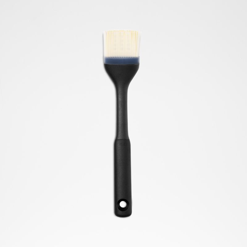 Baste poultry, sauce ribs and brush syrup onto cake layers with this OXO basting brush, specially designed with odor-resistant bristles to hold plenty of sauce and never clump or shred. The heat-resistant silicone won't scorch when greasing a hot pan, and the tapered bristles are safe to use on delicate foods. Between bastings, the brush can rest on the counter or grill table without creating a mess thanks to its angled head. Toss it in the dishwasher for easy cleanup.