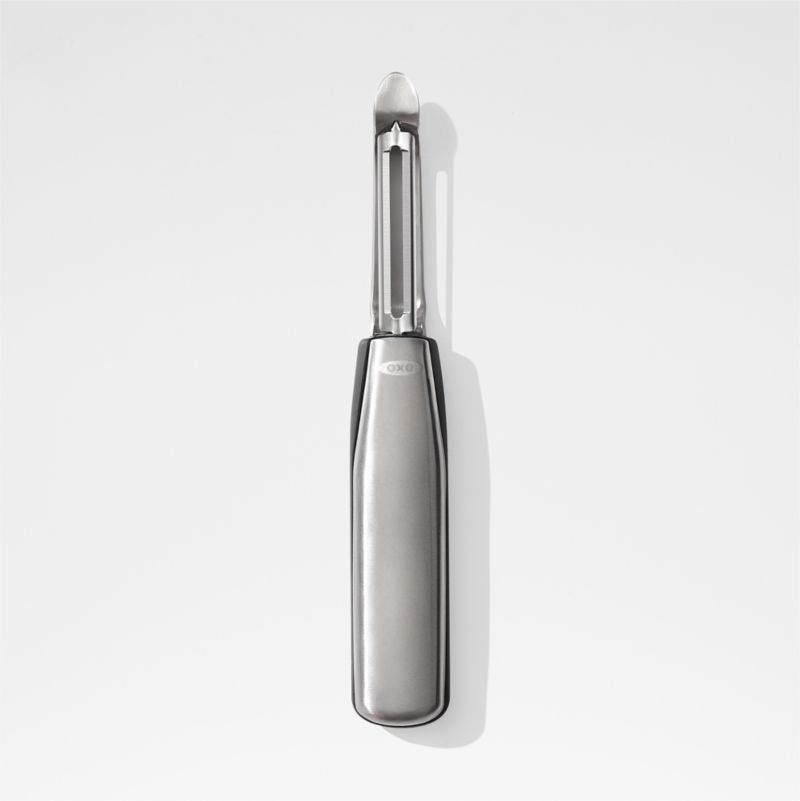 Tackle the mountain of apples needed for pie or make mashed potatoes in no time with this nimble peeler. Constructed of sharp stainless steel, the blade swivels to accommodate the natural shapes of your favorite fruits and vegetables so you can work quickly without gouging. A built-in eyer removes potato eyes and other imperfections, and the handle provides a comfortable grip.