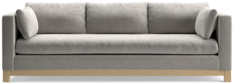Long, low and made for lounging, the Pacific bench sofa complements contemporary living rooms with its easy, breezy style. Sustainably sourced wood with a light finish anchors the large sofa with square legs and a full rail. Along with pillowy back cushions and supportive bolsters, the bull-nosed seat ensures a comfortable stay with a medium-density, not-too-deep cushion. You'll love it upholstered in Olef, a 100% recycled fabric with subtle textured slub and marled yarns.