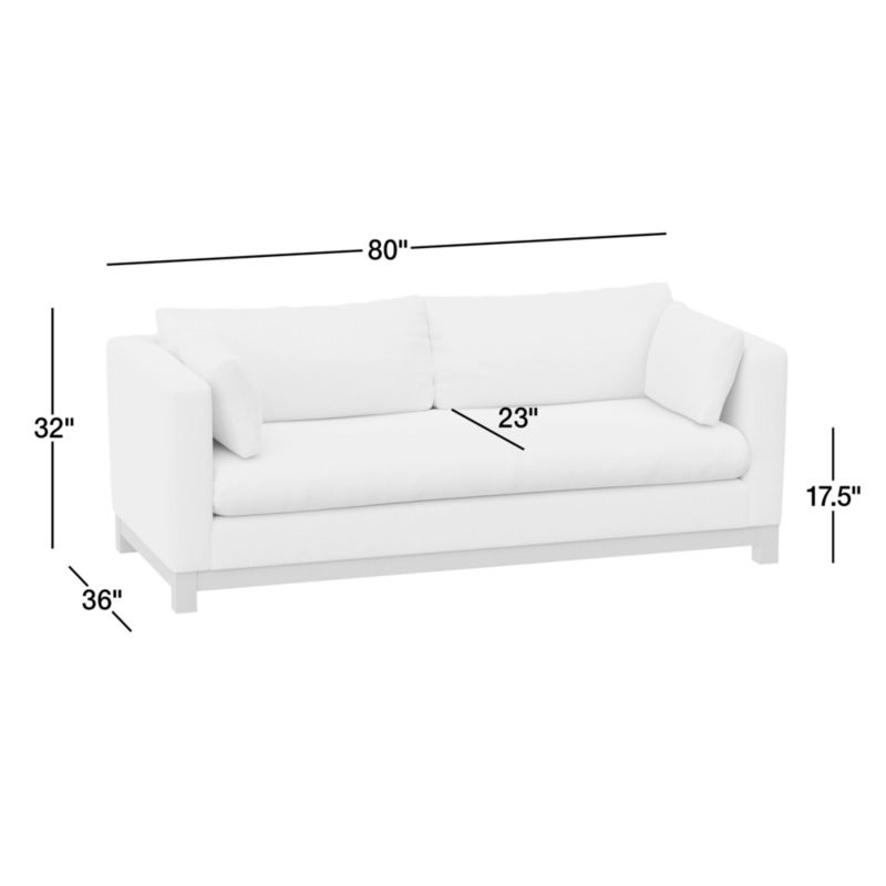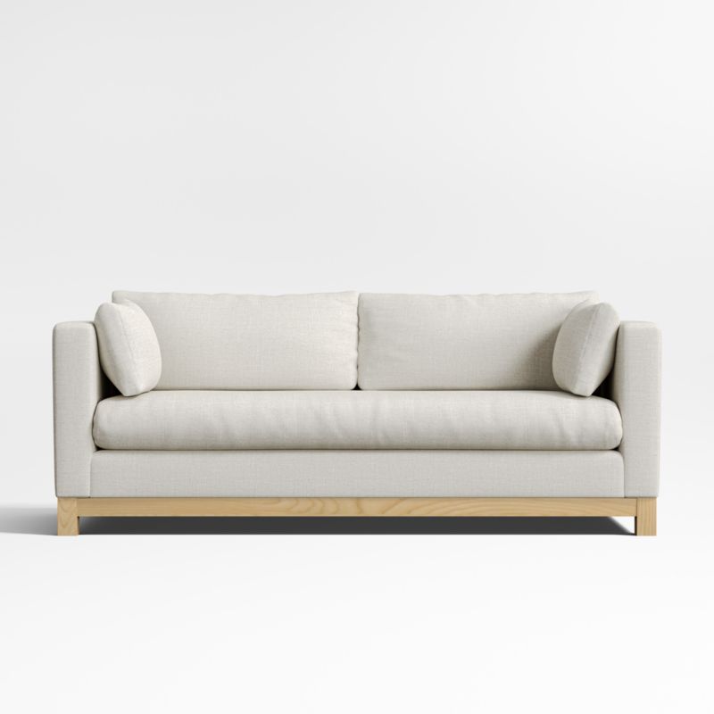 Long, low and made for lounging, the Pacific sofa complements contemporary living rooms with its easy, breezy style. Sustainably sourced wood with a light finish anchors the bench sofa with square legs and a full rail. Along with pillowy back cushions and supportive bolsters, the bull-nosed seat ensures a comfortable stay with a medium-density, not-too-deep cushion. You'll love it upholstered in Olef, a 100% recycled fabric with subtle textured slub and marled yarns.