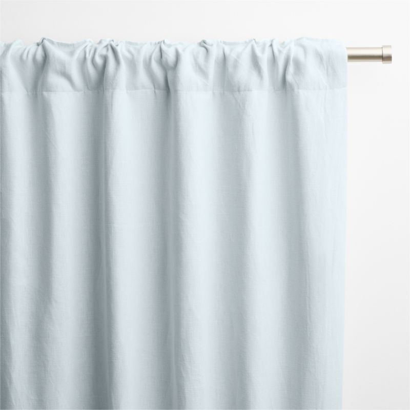 Sustainable linen weaves a luxurious blackout curtain in pale blue. Washed for enhanced softness, the curtain panel drapes beautifully while blocking unwanted illumination from outdoors. Hang our exclusive linen curtain with blackout liner from the back tabs for an elegant pleated style, use the rod pocket to create a more laid-back gathered look or add a set of our curtain clips (sold separately).