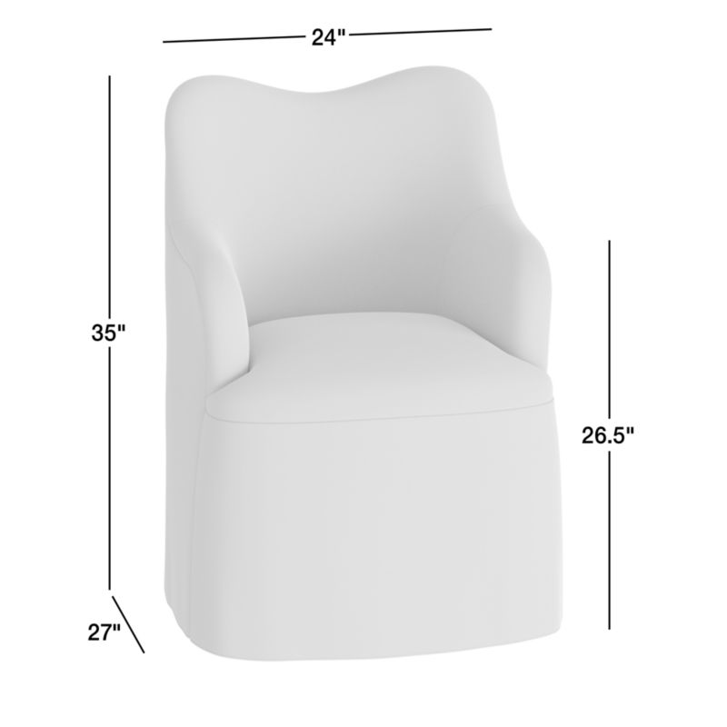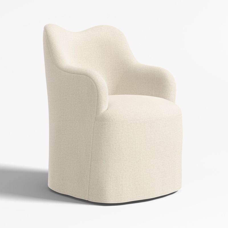 Channeling the rounded contours and relaxation of a living room armchair, our Paloma dining chair serves up fresh wingback curves along with table-lingering comfort. Tight tailoring of the upholstery highlights the sculptural form while keeping the look neat and refined. We love the subtle sense of movement and casual slipcover flair that the skirted seat lends to the chair's relaxed elegance. And Paloma swivels a full 360 degrees, letting you easily follow tableside conversation and take a sweeping view of the dining room.
