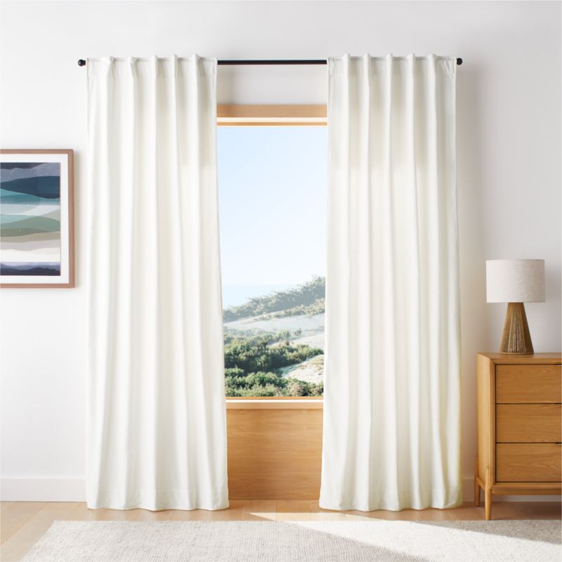 A good night's sleep calls for a dark room; a kid's space begs for a soft touch. These organic cotton velvet curtains deliver both, combining all the light-blocking qualities you want for bedtime or naptime with cozy, kid-friendly texture. The ivory panels are trimmed in a coordinating binding for a finished look. Hang from the back tabs for a traditional pleated style, use the rod pocket for a more gathered effect or add curtain clips for a laid-back look.
