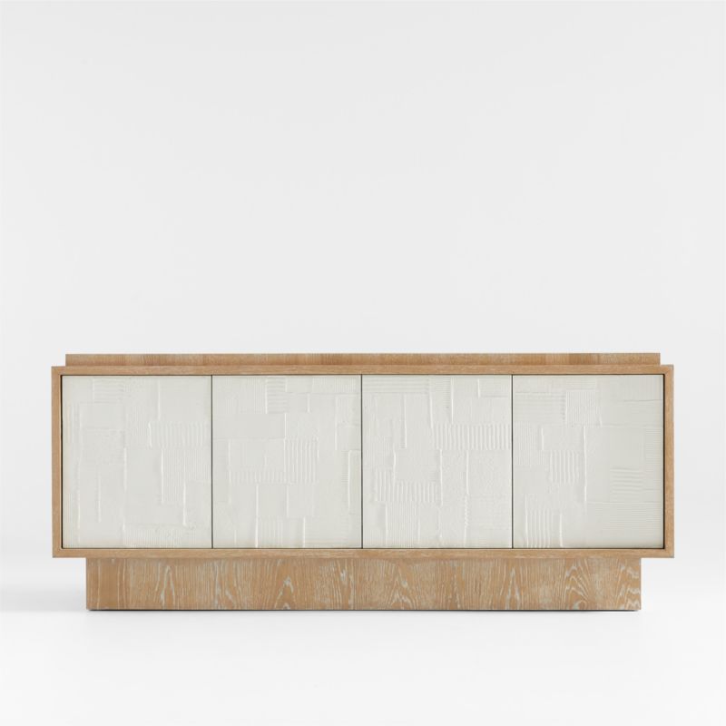 A tableau of hand-troweled artistry makes our gallery-worthy Panache console a true showpiece. Based on a gridded motif created by a Chicago plaster artist, the one-of-a-kind, textured reliefs on each of the four doors are handworked in resin. The lively grain of natural oak veneer highlighted with a light ivory ceruse finish provides the perfect complement and is prominently displayed in the recessed plinth base, box framing and stepped edge top. The console's exquisite exterior belies its practicality, found in the roomy interior and single adjustable shelf behind each double-door cabinet.