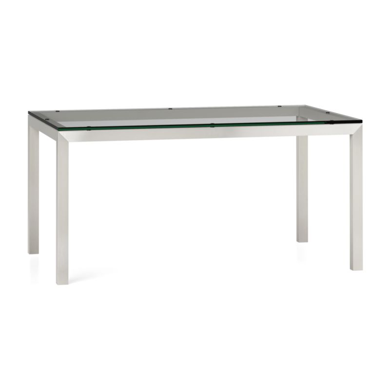 You've designed your ideal table, from top to bottom in just the right size. Clear float glass makes a transparent top that's ⅝-inch thick with a flat, polished edge. To complement its clean, simple lines, this stainless steel Parsons-style frame gets a soft, contemporary brushed finish that mimics mitered wood corners. The Parsons Clear Glass Top/ Stainless Steel Base Dining Tables are Crate & Barrel exclusives.