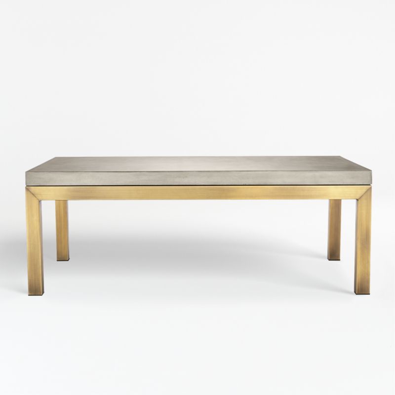 Sleek and rectangular top is cool concrete, handmade from a proprietary mix of marble, stone and granite powders with natural fibers for added strength in a shop powered without fossil fuels. Adding to the small coffee table's minimalist aesthetic is the clean-lined base, accented with a lightly brushed finish and hand-detailed corners. The Parsons Concrete Top/ Brass Base 48x28 Small Rectangular Coffee Table is a Crate and Barrel exclusive.