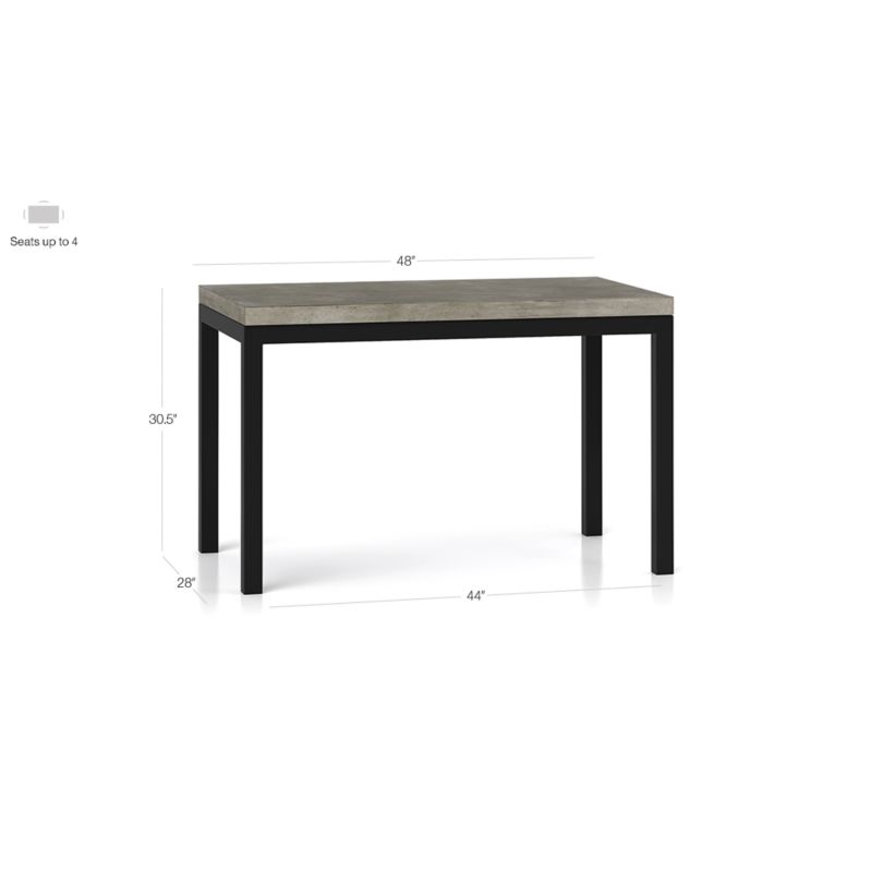 You've designed your ideal table, from top to bottom in just the right size. The warm grey concrete top is a mix of marble, stone and granite powders with natural fibers for added strength. This industrial, modern surface is handmade in a shop powered without fossil fuels. Due to the handmade nature of the concrete mix, color will vary and may change over time. The traditional Parsons-style base is a hot-rolled steel frame that supports with clean simple lines, hand-welded and ground at each corner with a raw, torched millscale finish. Perfect for kitchens and smaller spaces, this table seats up to 4. The Parsons Concrete Top/ Dark Steel Base 48x28 Dining Table is a Crate and Barrel exclusive.