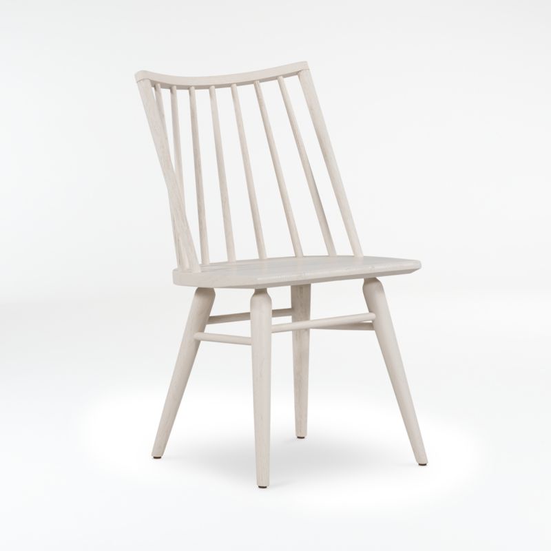 Paton updates the classic Windsor chair, refining its time-honored spindles, saddle seat and curved back into a fresh silhouette. Made of solid oak, the chair is wire brushed to bring out its cathedral grain and stained creamy off-white. We love its tradition-tinged lines paired with our mixed metal, industrial-chic tables. Our Paton off-white Windsor dining chair is a Crate and Barrel exclusive.