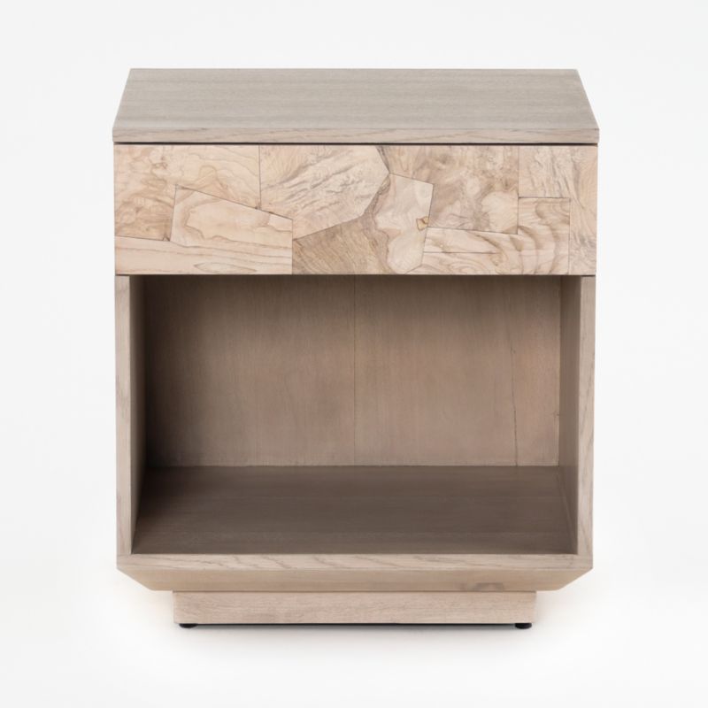 The Paulina nightstand's artful parquet of uniquely grained burl wood brings warm, organic drama to the bedroom. Finished with a white wash and elevated on a stacked plinth base, the mahogany veneer frame encases an open storage space and a single drawer accented with ash burl veneer. Assembled by hand of precisely cut pieces, the flat drawer front is integrated into the clean design for a seamless look.