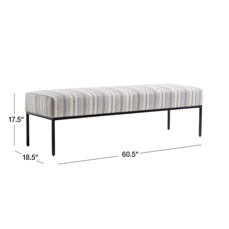 An easy way to revitalize a living room or entryway, our Pax bench showcases fresh stripes on a clean-lined frame. The bench's generously sized box cushion sits on black-finished solid mango wood legs, a linear design that's perfectly complemented by the modern striped upholstery in decor-friendly grey and natural. Made of cotton and jute, the fabric looks crisp and offers a great textured hand.