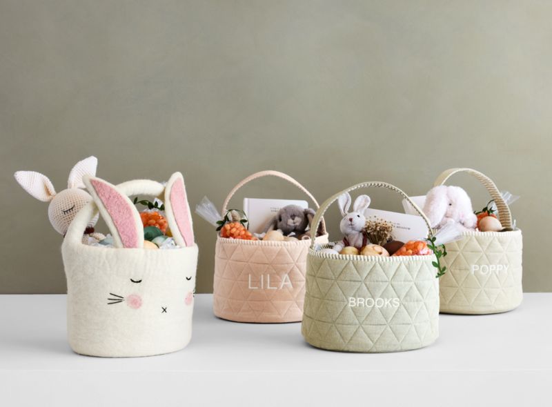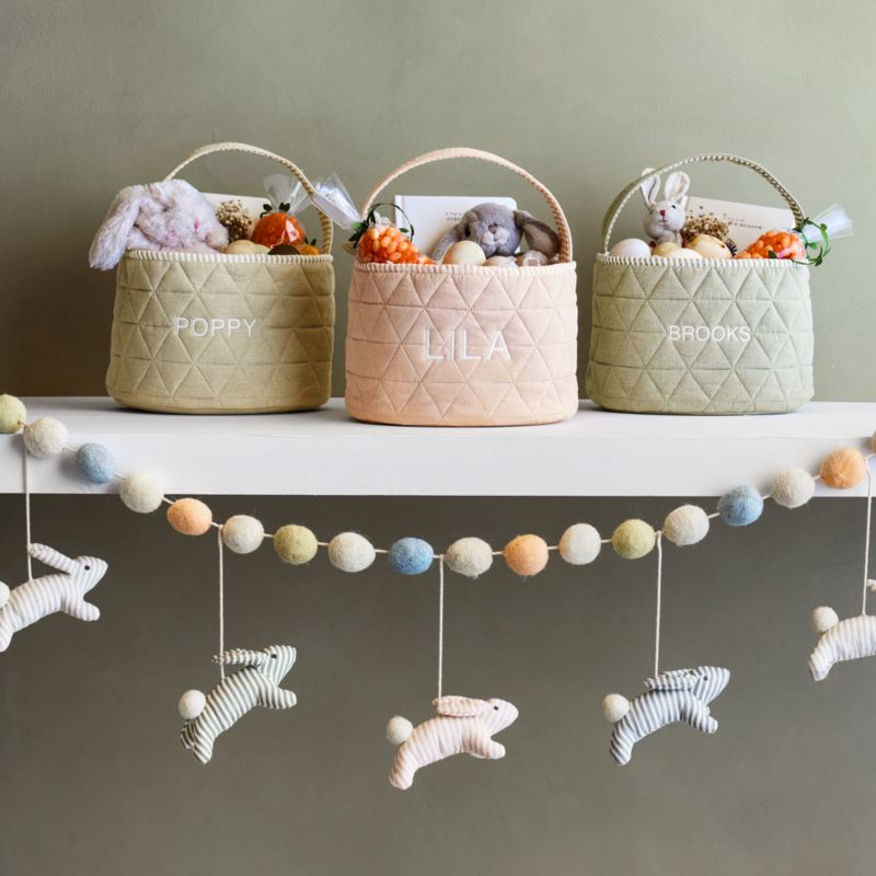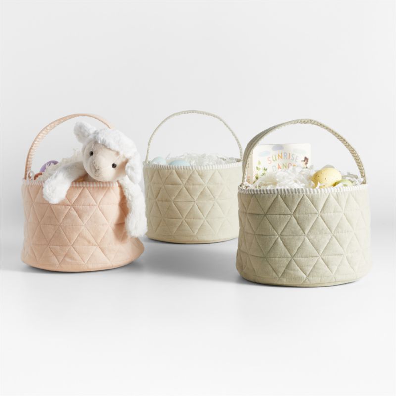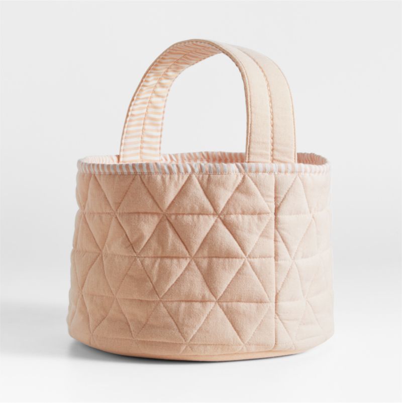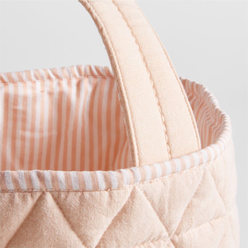 Bring smiles to little ones' faces with our Quilted Easter Basket in a cheerful peachy pink hue, ready to be filled with eggs, treats and other holiday surprises. Delightfully detailed with a triangle stitch pattern and pinstriped lining, this soft, washed cotton basket is designed to last for many egg hunts to come. It even doubles as a playful storage bin in the off-season.