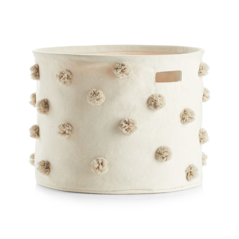 Designed for versatility and convenience (not to mention playfulness), this storage bin features a space-saving, collapsible design. It's made from 100% cotton and adorned with an array of gloriously fun handmade pom poms. Use the cutout handles to carry it anywhere there's clutter—it's sized perfectly for small toys, clothes or even toiletries.