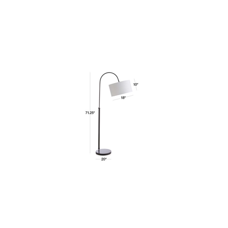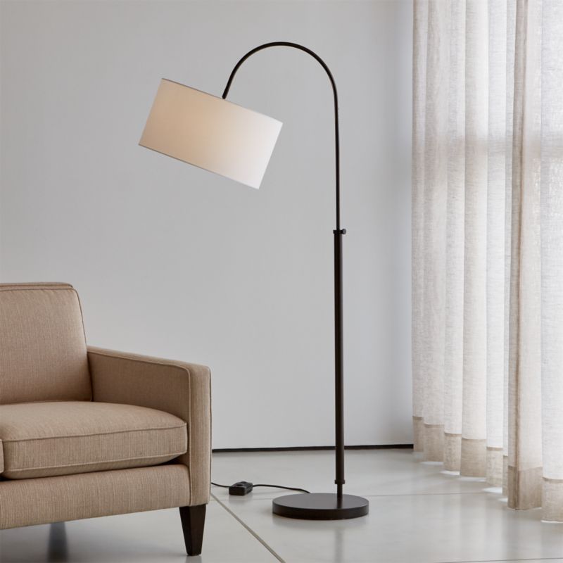 Ideal for apartments and smaller-scaled living rooms, this petite version of an arc lamp casts a warm glow and a modern look. Suspended on a streamlined base in dark bronze, the white drum shade arches perfectly over a loveseat or bedroom reading nook. Made to suit your space, the lamp adjusts up and down and swivels right to left for just the right amount of light. A full-range dimmer on the cord creates a range of moods, from lowlight romance to book-reading bright. Designed by Mark Daniel, this clean, contemporary lamp is a Crate and Barrel exclusive.