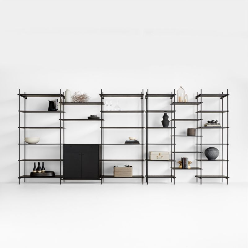 Architecturally graphic yet light and airy, Petra revamps whole-home storage to suit your space and wow your walls. A vision in black, the cabinet and bookcases are made of ebonized solid oak and oak veneer and iron tubing that's finished with a blackened acid patina. The expansive configuration pairs wide and narrow bookcases on either side of a central cabinet with offset shelves bridging between them. Open and closed storage abounds with a total of 36 open shelves, a drawer and cabinet space. Linear and minimalist, Petra updates mid-century wall systems for a look that's distinctly contemporary and truly room-transforming.