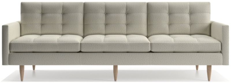Petrie is a grandly scaled three-seat sofa that sits at the intersection of mid-century and today, with clean lines and tailored cushions expertly button-tufted by hand. Now a Crate and Barrel classic, its pure 1960s aesthetic is scaled deep so you can sit firm and upright, but also slouch back in comfort. Well-suited to make a great impression, the menswear-inspired fabric tailors Petrie's sleek, boxy cushions and slim track arms with heathered color and soft texture. The Petrie Midcentury Sofa is a Crate and Barrel exclusive.