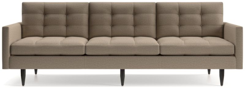 Petrie is a grandly scaled three-seat sofa that sits at the intersection of mid-century and today, with clean lines and tailored cushions expertly button-tufted by hand. Now a Crate and Barrel classic, its pure 1960s aesthetic is scaled deep so you can sit firm and upright, but also slouch back in comfort. Well-suited to make a great impression, the menswear-inspired fabric tailors Petrie's sleek, boxy cushions and slim track arms with heathered color and soft texture. The Petrie Midcentury Sofa is a Crate and Barrel exclusive.